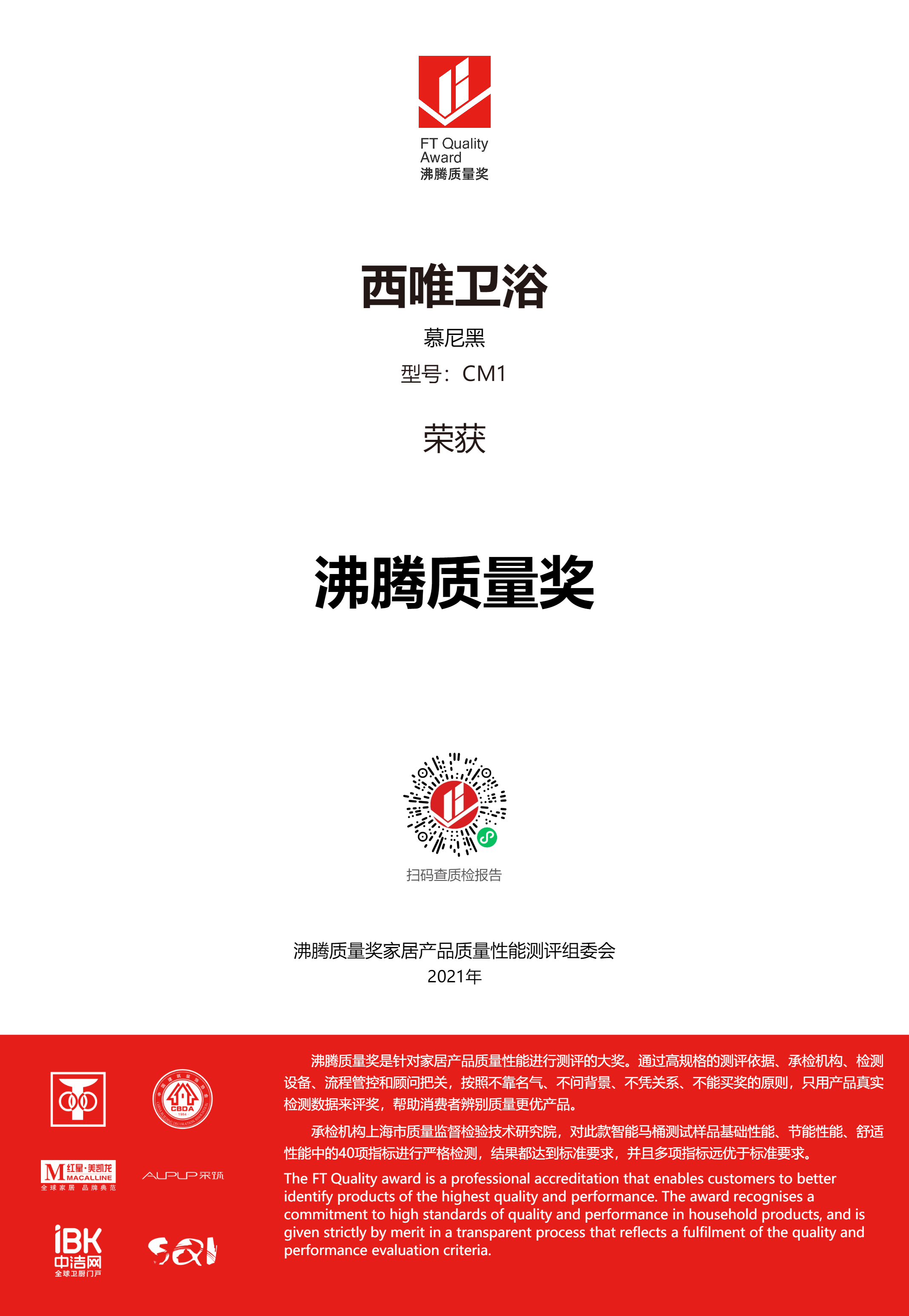 获奖证书-智能马桶-西唯卫浴-CM1智净杯新锐卫浴十大品牌建陶质量大会科技领先产品奖建陶质量大会质量创新奖保险证书
